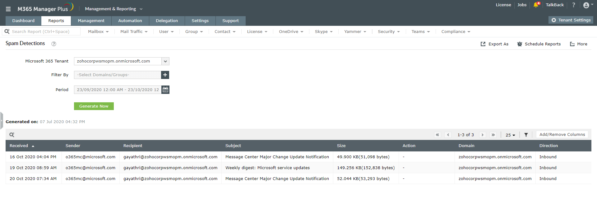 This report gives the list of spam e-mails including details such as senders, receivers, subject of the mail, and so on. Besides the manual report generation steps mentioned above you can also schedule the reports to be generated and emailed to the respective stakeholders, in the format (PDF,CSV,XLSX or HTML) that you prefer, and at the configured intervals. Apart from this, in M365 Manager Plus you can add these reports as widgets to your dashboard to surveil the spam and malware activities.