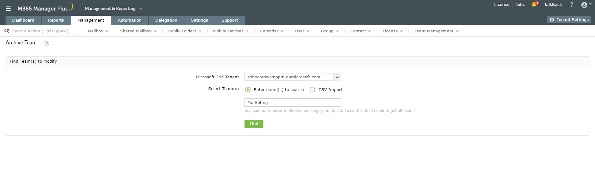 The user-friendly interface of M365 Manager Plus enables you to archive teams in bulk using CSV files. You can get the job done in a matter of seconds without having to type long and complex group IDs or codes every time.