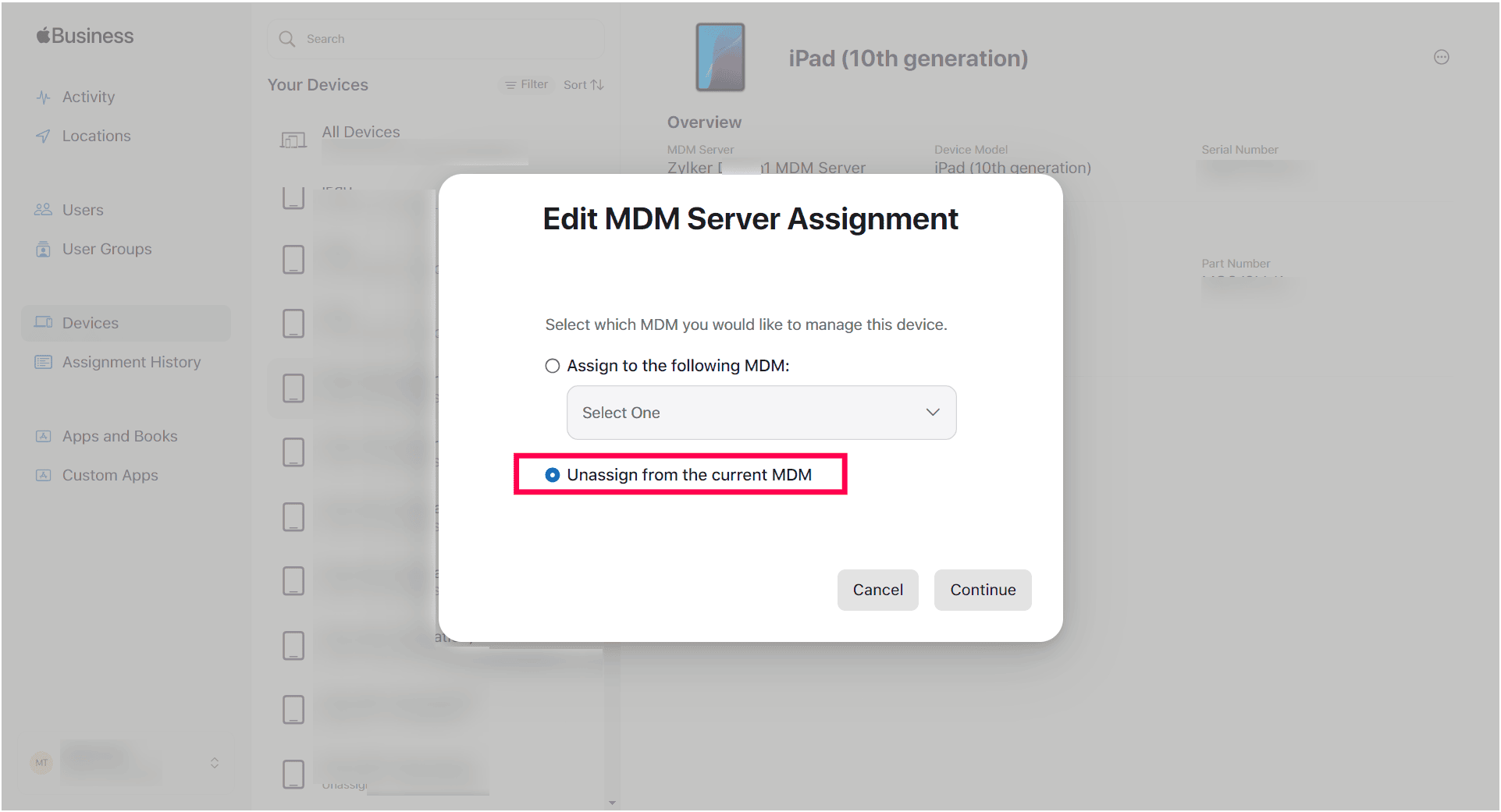 - Click on "..." option and click on "Edit MDM Server" and choose "Unassign from the Current MDM". If removing multiple devices, you can also upload a CSV file with the device details for bulk unassign.