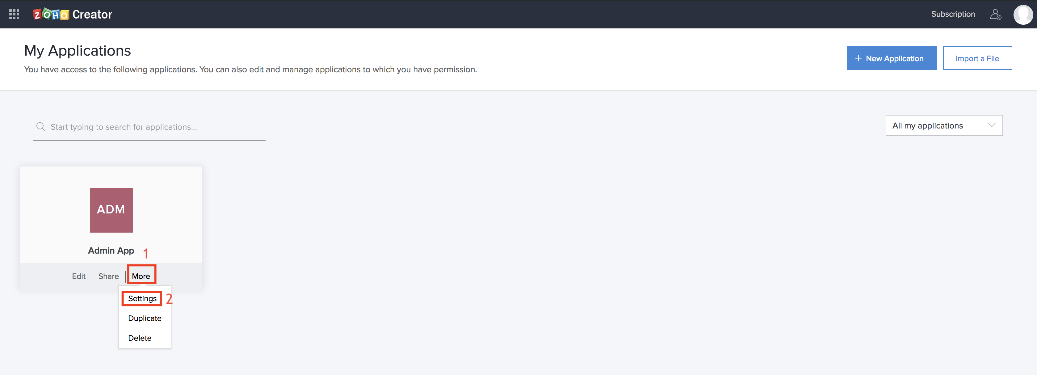 - Login to Zoho Creator using your Zoho Account and hover on any of your previously created apps. Click on More and select Settings.