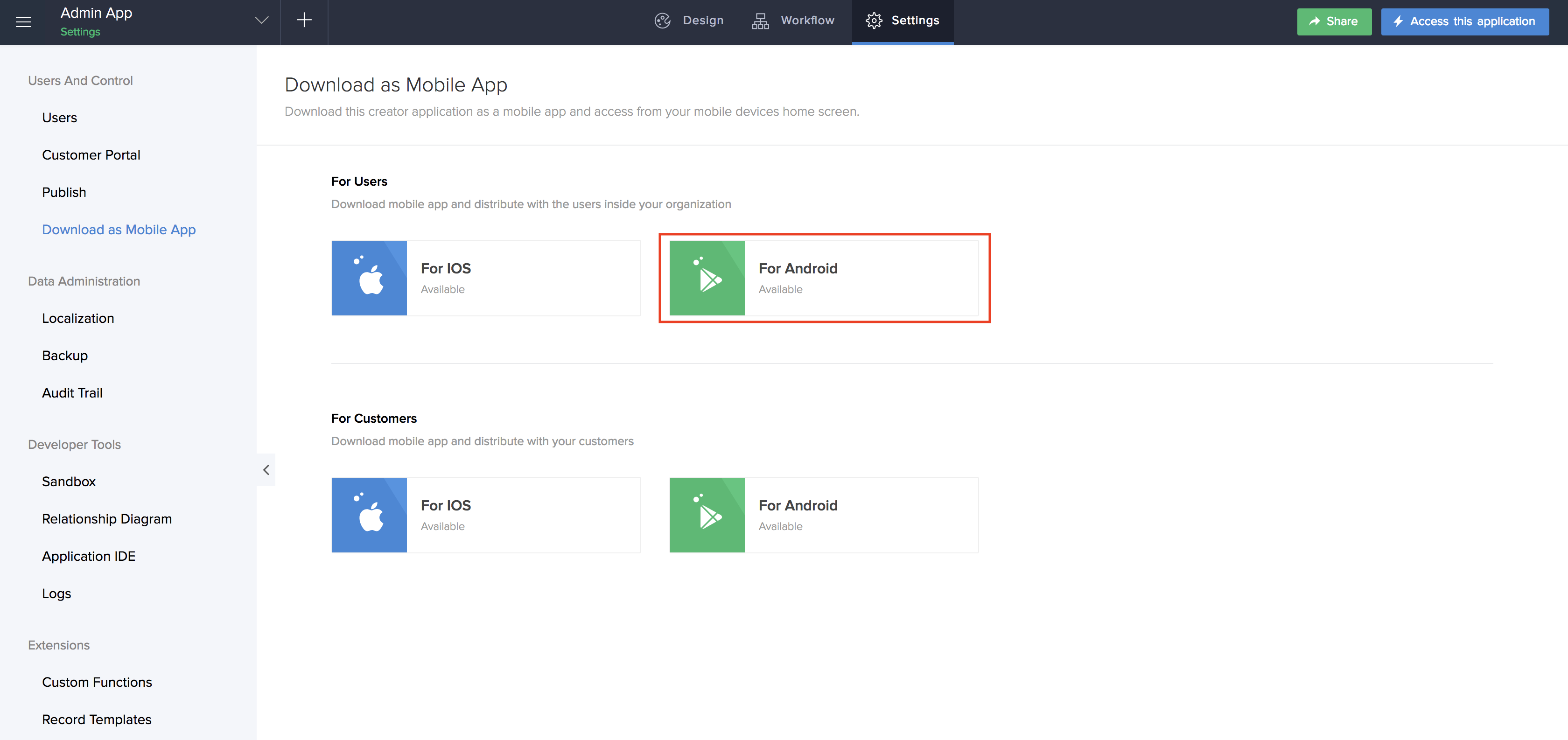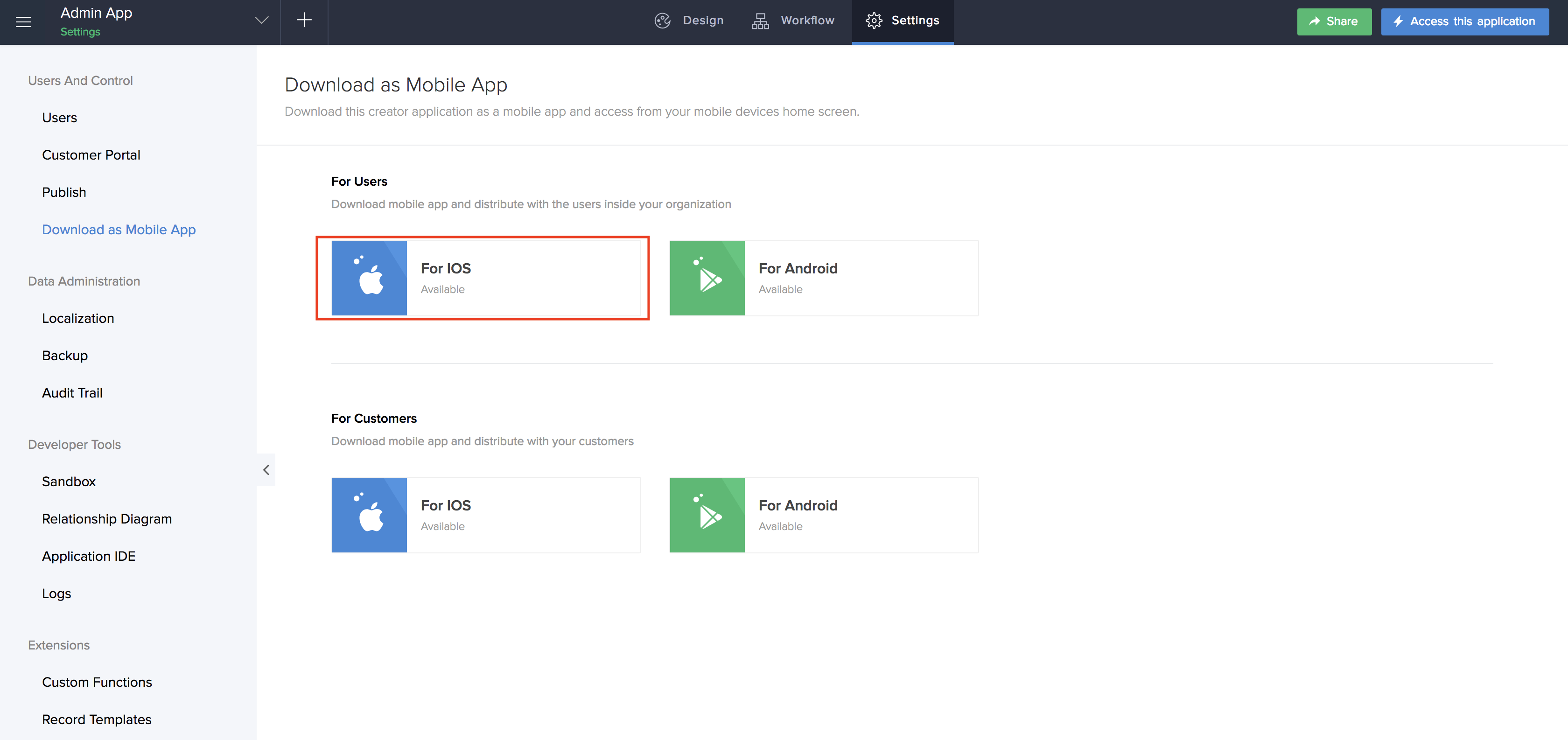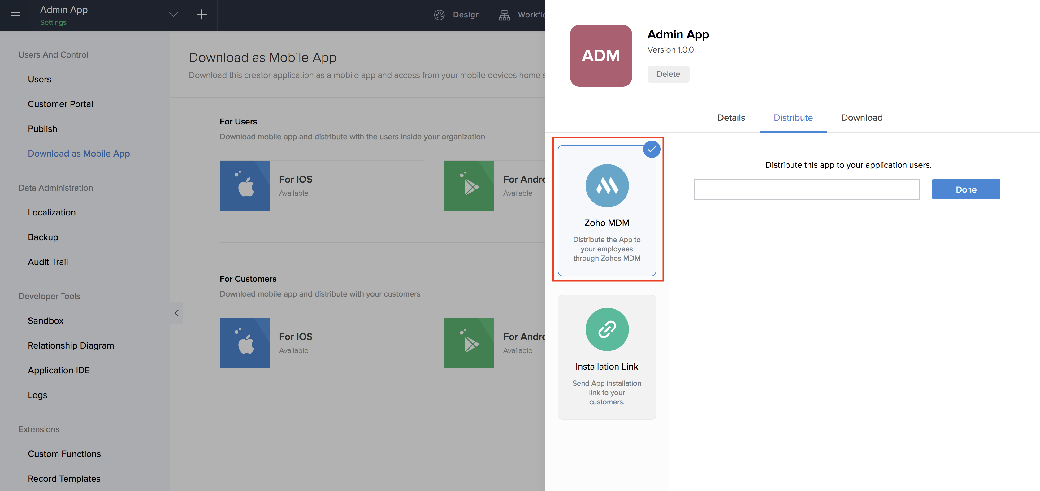 Zoho Creator, from the stables of Zoho, is an application used for creating web apps irrespective of your technical expertise. With more and more organizations moving to a mobile-first workforce, Zoho Creator also lets you convert these web apps into mobile with just a click. But distributing these apps becomes a problem, especially in case of large scale organizations. This integration ensures distribution of apps developed via Zoho Creator, can be easily and efficiently distributed. You can distribute apps for both Android and iOS. This is supported only for MDM Cloud.