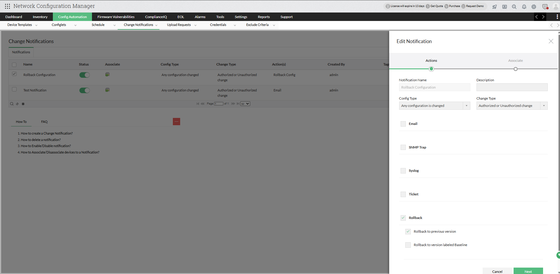 - Real-time change notifications: Network Configuration Manager promptly notifies users of any detected changes to devices through various notification mediums such as email, SNMP traps, Syslogs, and tickets. This enables users to stay informed about changes as they occur, preventing them from evolving into configuration drift and allowing immediate action to be taken.