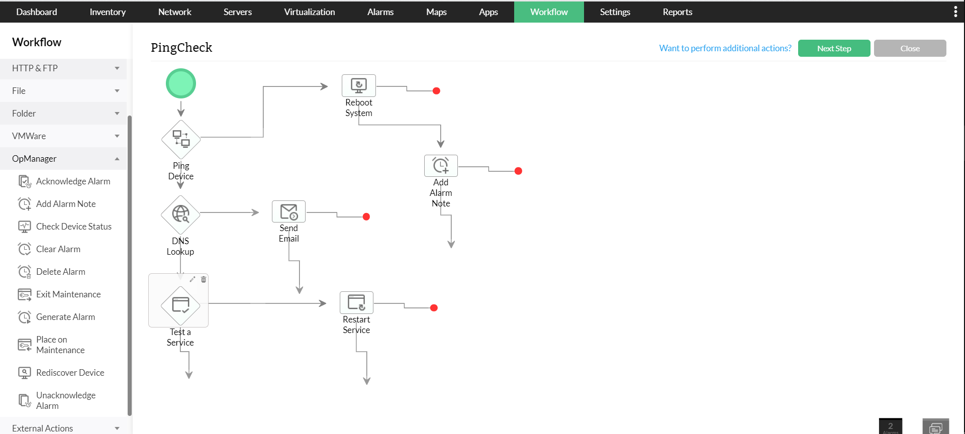 - Workflow: Administrators have preset routine (run book) tasks to perform either during network faults or as an on-‐going maintenance task. These first level troubleshooting steps and repetitive laborious maintenance tasks can now be orchestrated and automated through a powerful IT workflow automation engine. Workflow is an intelligent automation that allows the user to automate tasks by defining the conditions, as well as, selecting the devices and commands. With over 80 workflow actions, users can automatically restart, resume, or stop services and servers, execute configuration templates, and push configurations based on custom rules.