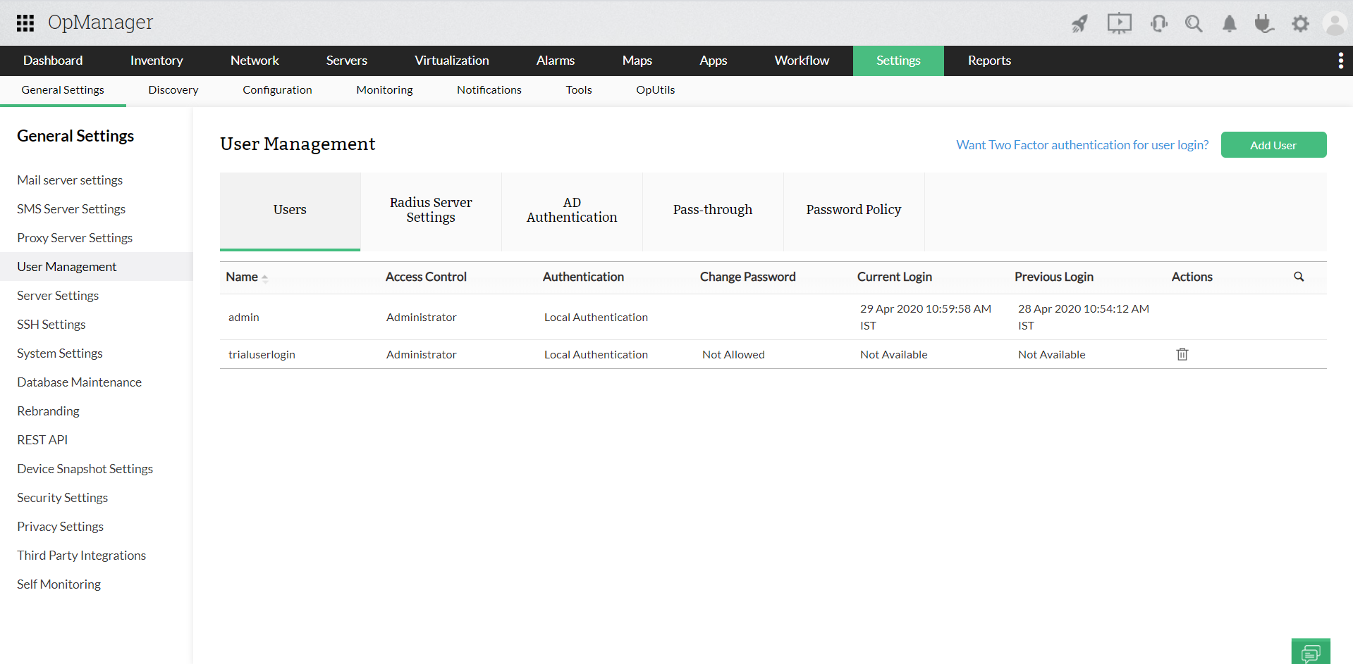 - User Management:User Management helps organizations ensure network security by providing access to designated users. With OpManager, users can be authenticated without using an external third party identity management tool. Apart from providing access to users with roles, you can also define the scope for users. This helps IT teams with multiple staffs as it clearly defines their boundaries. User management in OpManager involves: