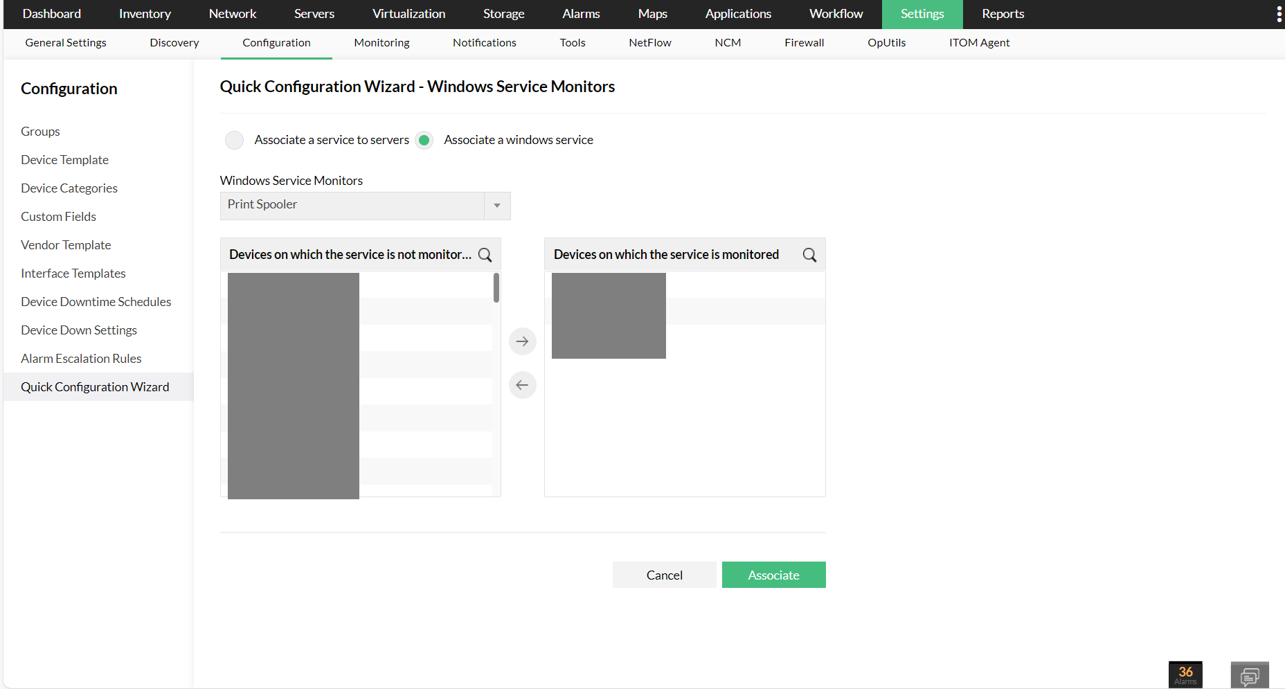 You can also associate/dissociate service monitors to devices from the Quick Configuration Wizard. Go to Settings → Configuration → Quick Configuration Wizard → Service Monitors and associate/dissociate services to devices as mentioned above.