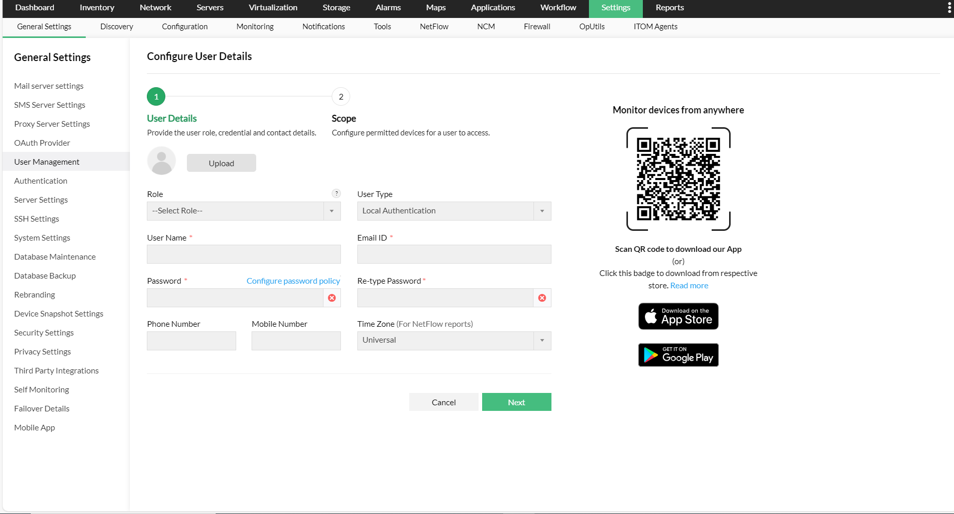 Monitor - Based on the option chosen here, access to devices in the allowed add-on modules will be determined. Click here to learn more about the types of User scopes in OpManager.