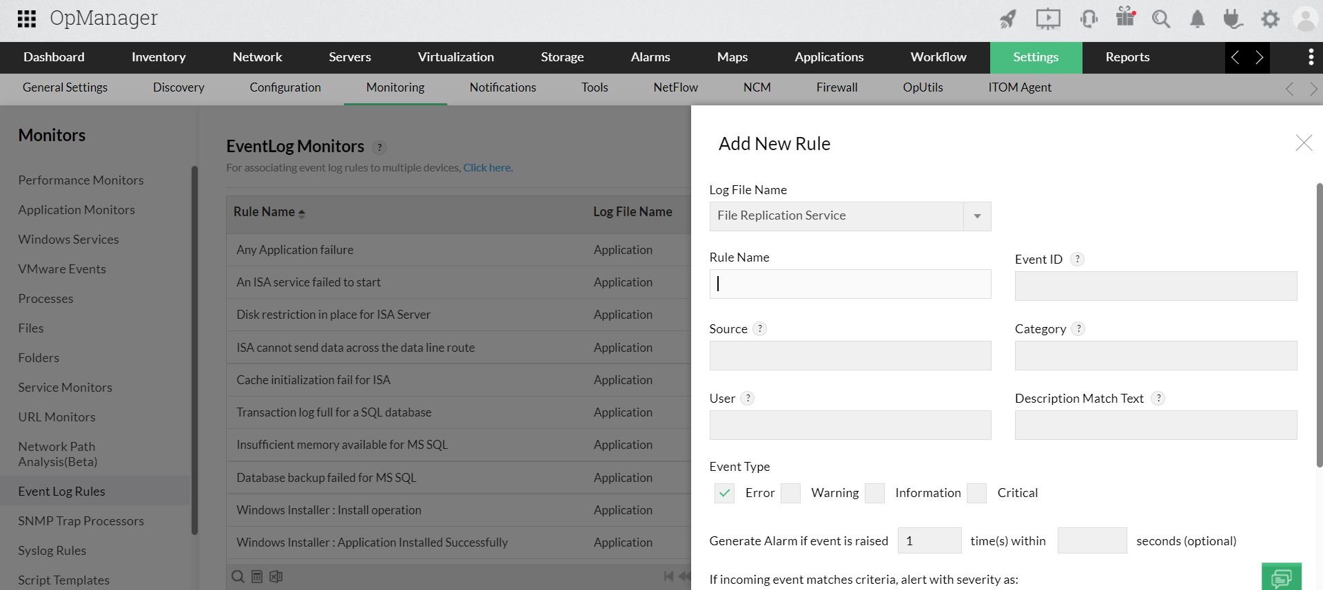 You can monitor event logs under a custom category too. Some applications log the events in a new category other than the default System/Applications/Security category. You can now configure rules in OpManager to parse the events in such custom categories and trigger corresponding alerts in OpManager. Here are the steps: