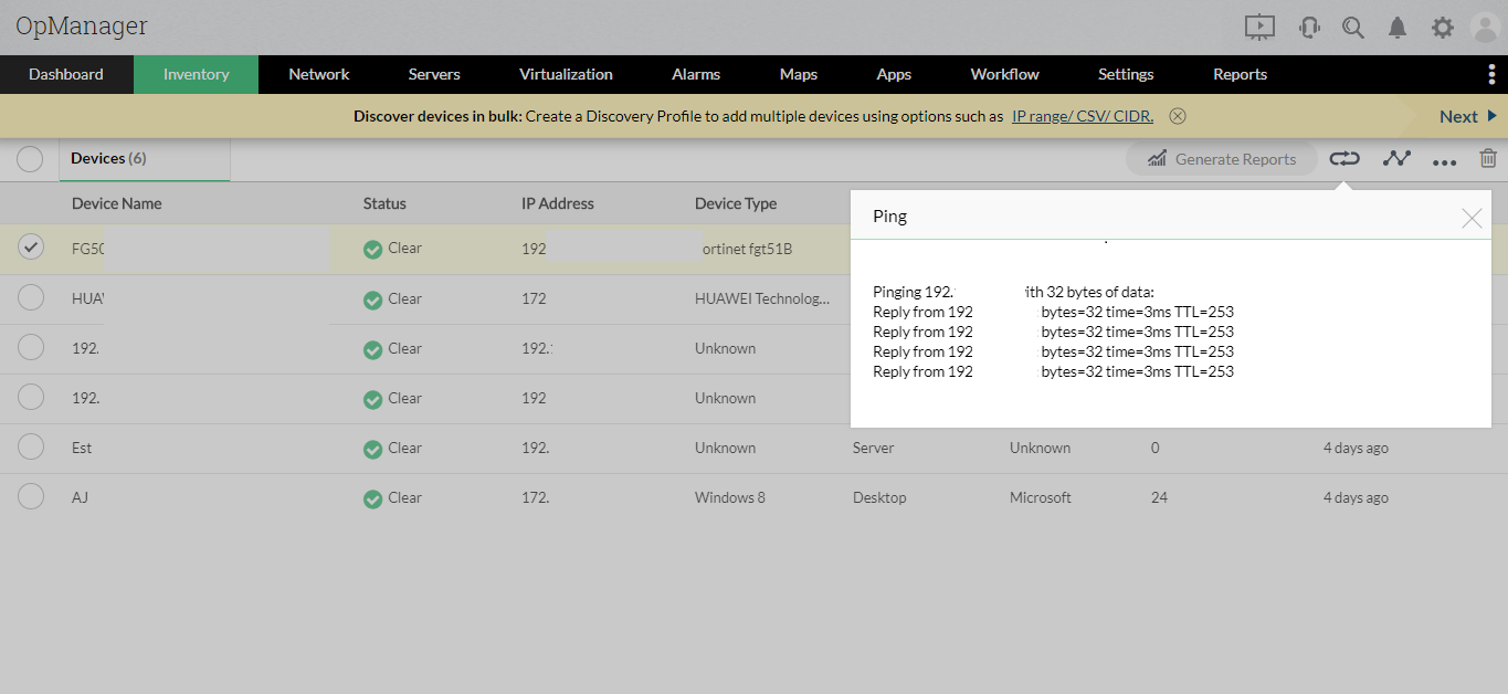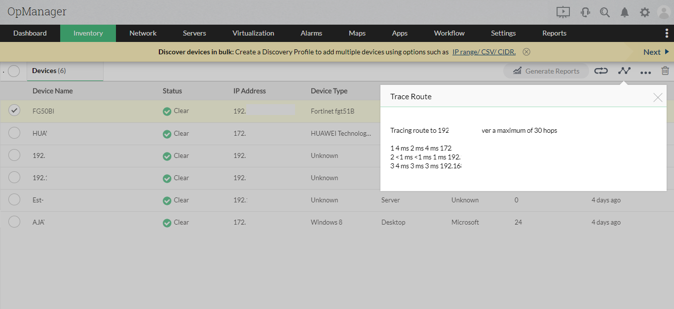 The device inventory is made up of all devices discovered by OpManager. On the Device Summary page, you can find graphs detailing Tx traffic, Rx traffic, and uptime. Ping device and Trace Route are also available to track network activity.