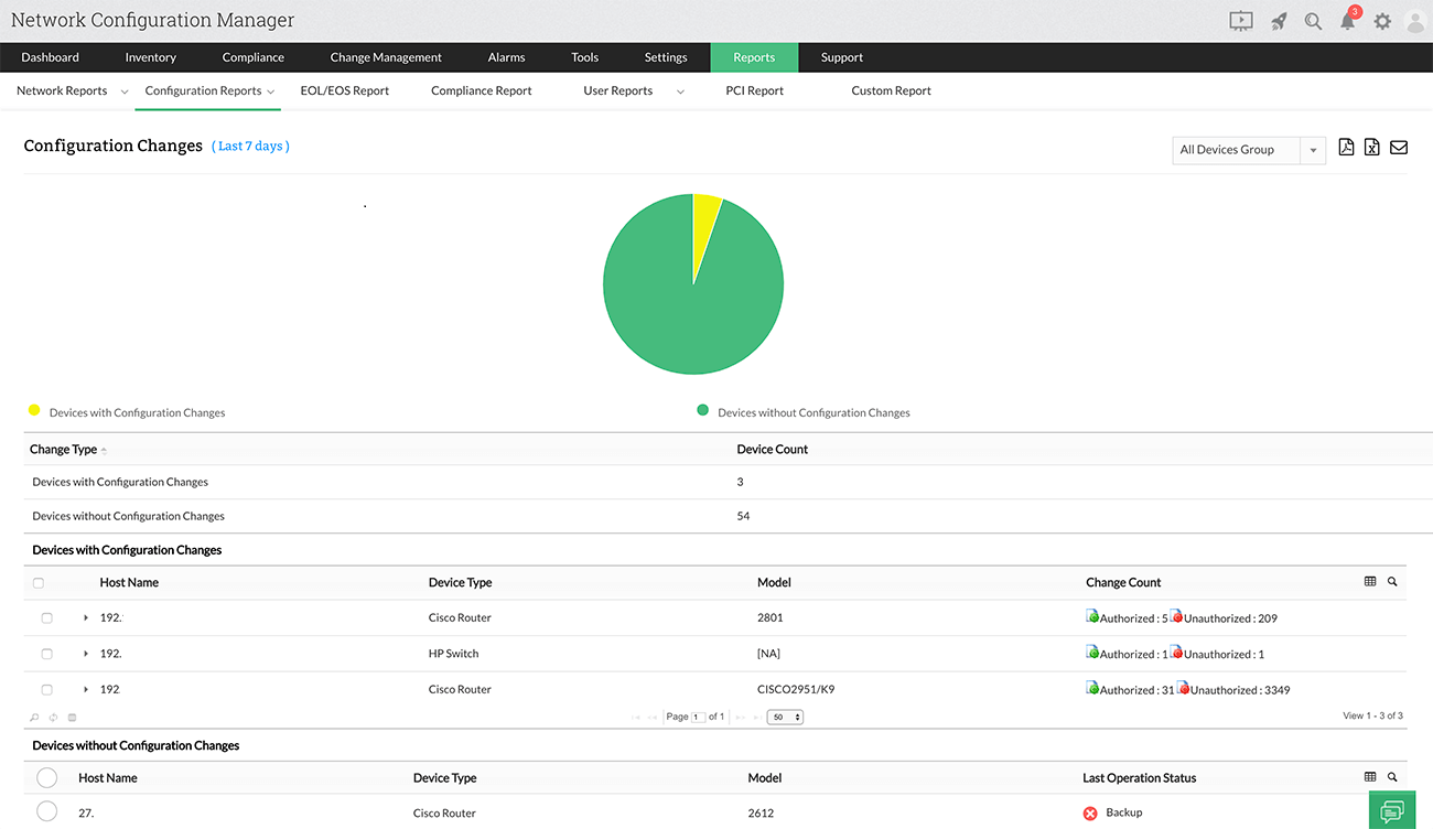 Network admins make frequent network device configuration changes to serve different business needs, and need to maintain a record of all the configuration changes made, when they were made, and who made them. Maintaining a history of configuration changes will help identify the root cause of an issue whenever one pops up. Network Configuration Manager, an add-on within OpManager, helps in tracking change in network activities with configuration backups, compliance management, configuration task automation and execution, configuration reports, and firmware vulnerability management.
