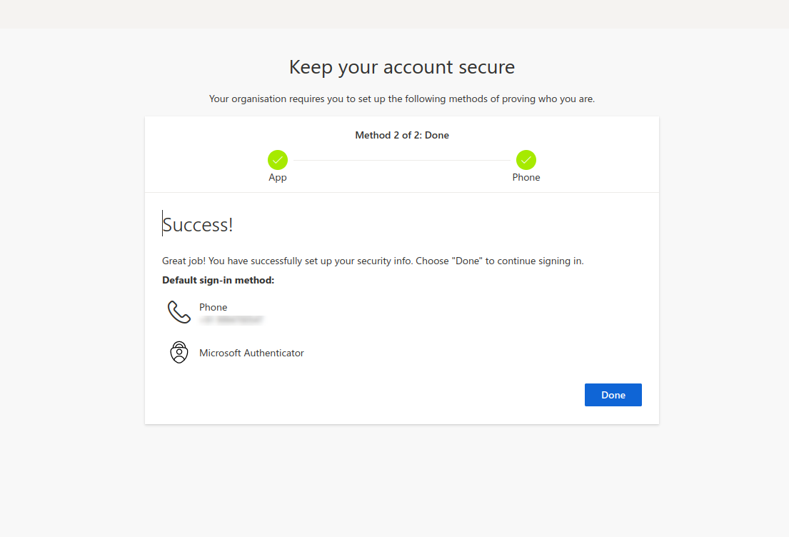 - When you log into the Azure portal for the first time, you will be redirected to the Keep your account secure screen.