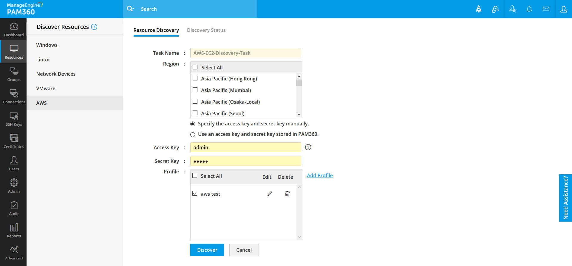 - On successful discovery of resources, you can add All/ Selected Resources into PAM360.