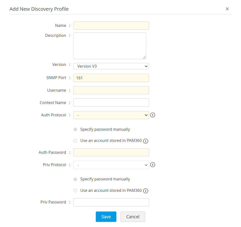 Before proceeding with discovering the network devices, you should create discovery profiles that help PAM360 to use common details for discovering multiple devices.