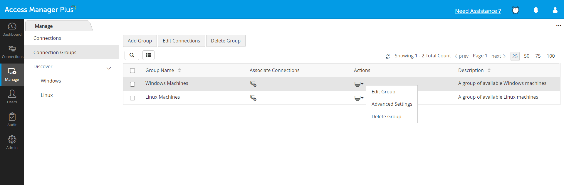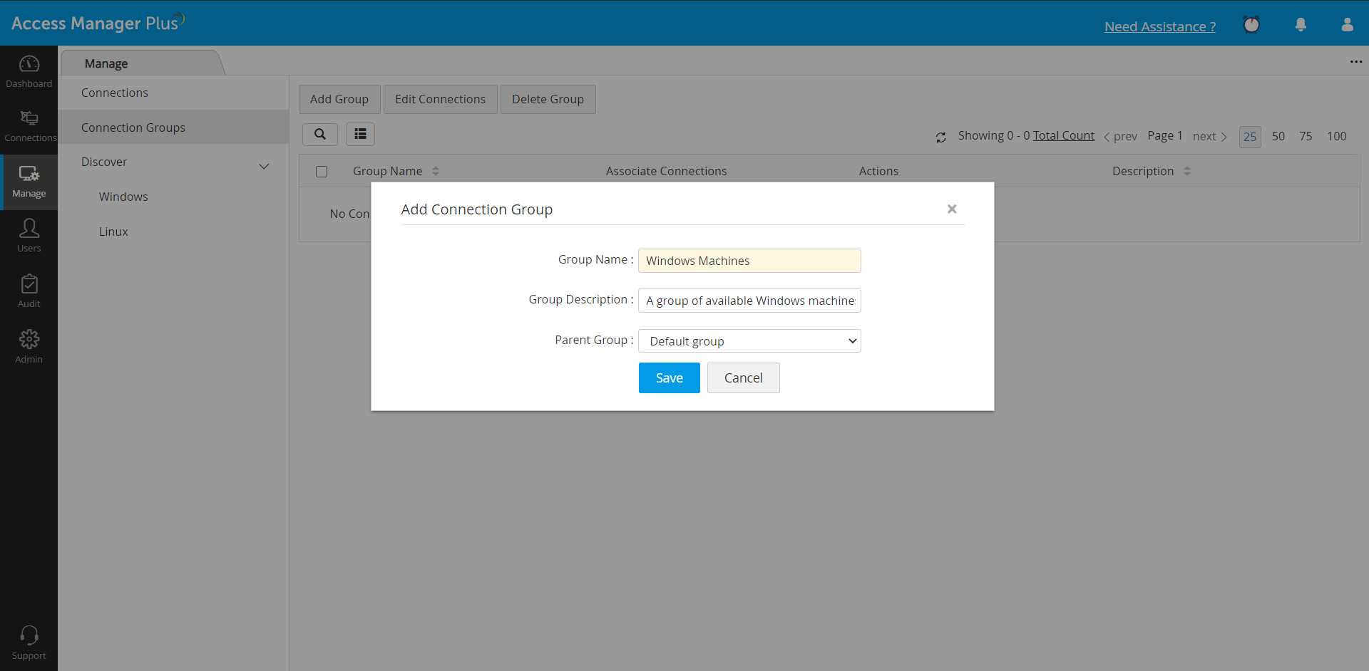 Access Manager Plus lets you create connection groups to facilitate bulk edits and bulk configuration of settings to all the connections associated with that particular group. Connection groups can also serve as a means to combine similar types of connections under one umbrella and view them separately from the Connections tab.