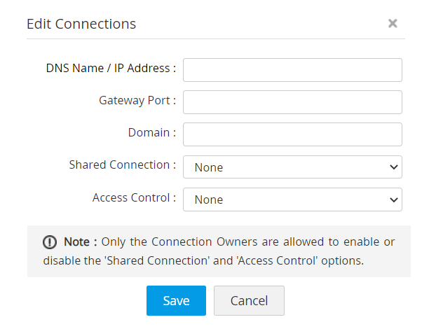 - Select the required connection groups and click the Edit Connections option from the top. In the Edit Connections window, you can change the following attributes for all connections that are part of the selected groups: DNS Name/ IP Address, Gateway Port, Domain. However, while the aforementioned attributes can be modified by anyone, only the respective connection owners can enable or disable the Shared Connection and Access Control options.