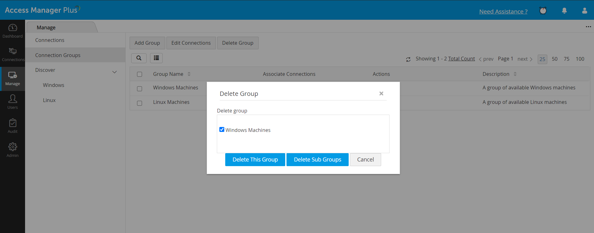 - To delete a single group, click the Group Actions drop-down beside it and choose Delete Connection Group [OR] To delete multiple groups at a time, select the groups and click Delete Connection Group from the top bar.