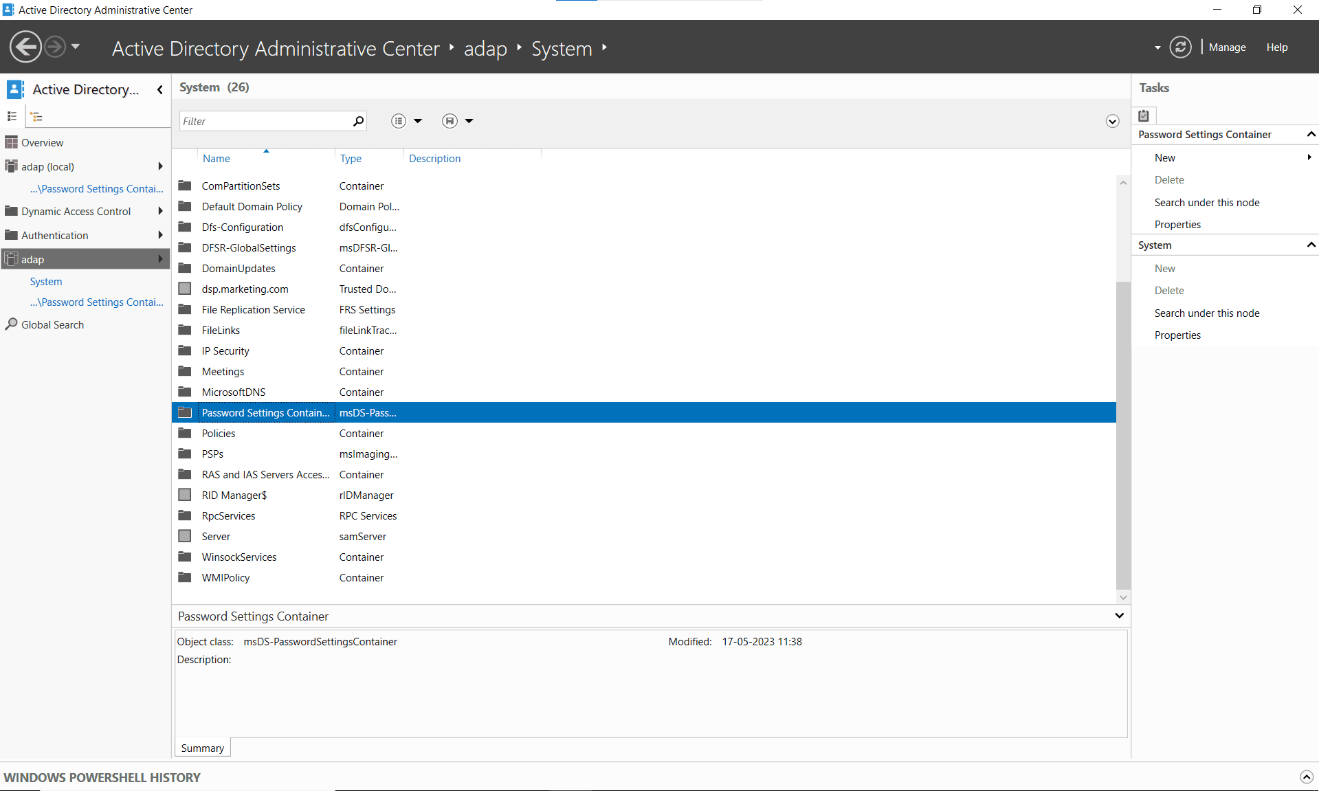 - On the right pane, click New > Password Settings. This will open the Create Password Settings window. Each policy is saved as a password settings object (PSO) in the Password Settings Container.