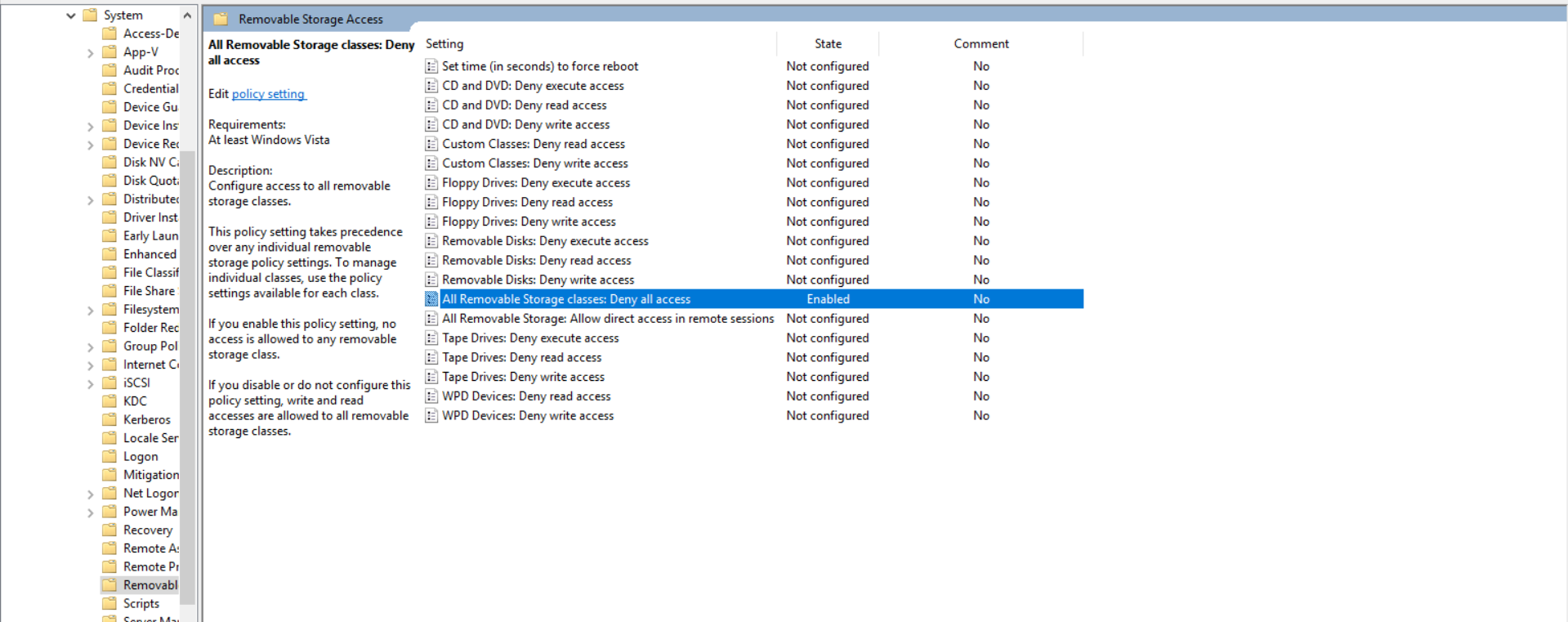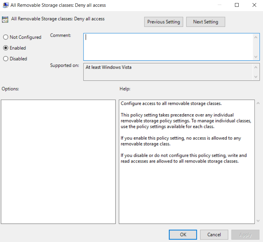 Double click the All Removable Storage classes: Deny all access policy. Select Enabled and click OK.