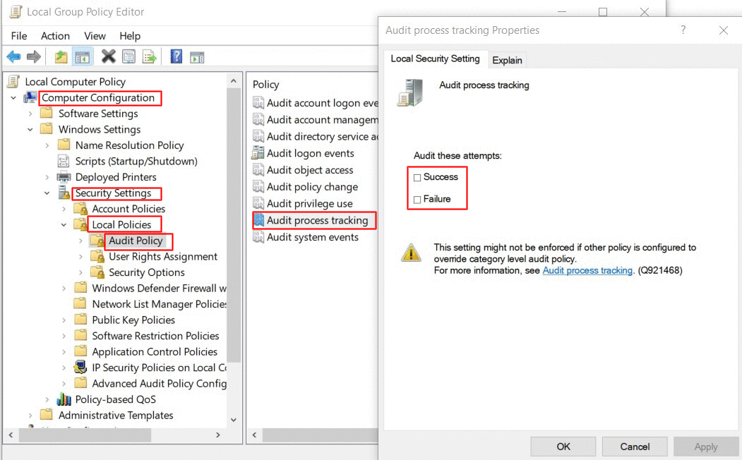 Expand the Computer Configuration → Windows Setting → Security Settings → Local Policies → Audit Policy → Audit Process Tracking.