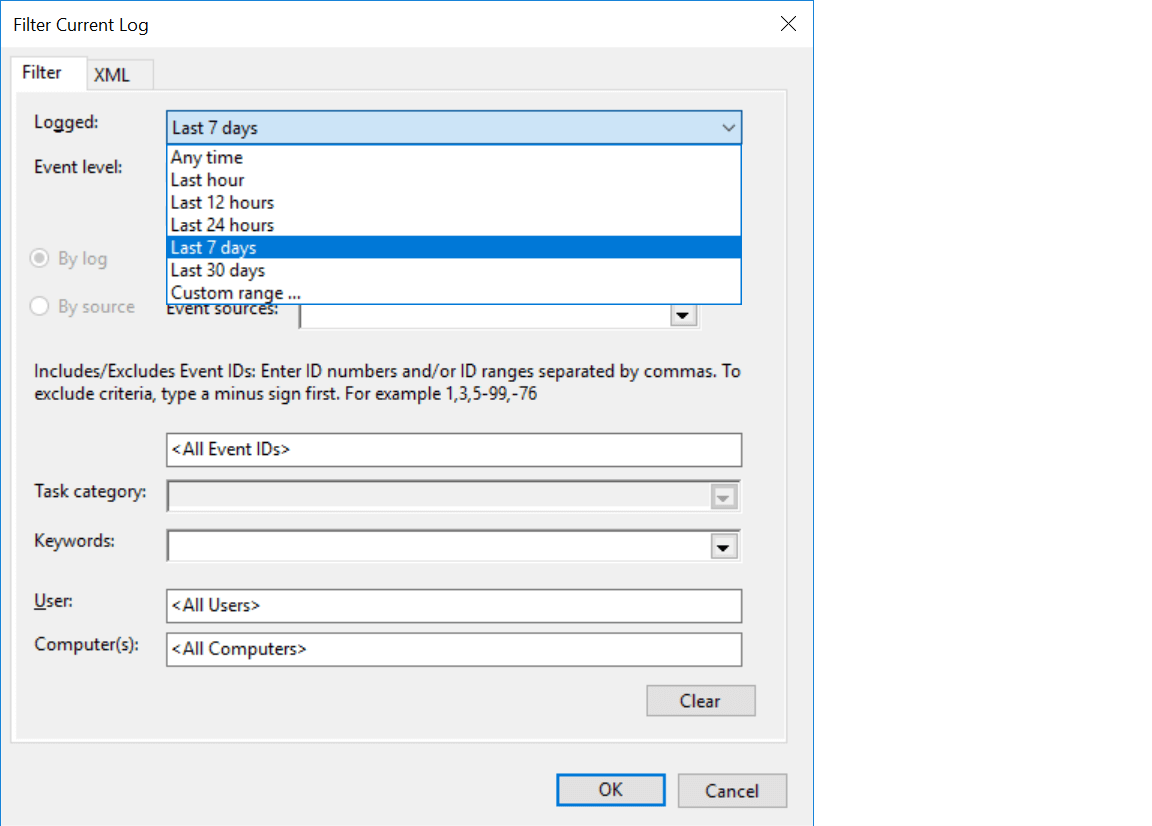 Click Filter Current Log on the right side to filter the logs based on event IDs or the time range for which the information is required.