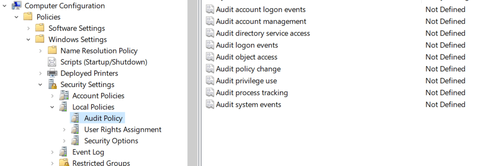 In the Group Policy Editor, navigate to Computer Configuration -> Policies -> Windows Settings -> Security Settings -> Local Policies -> Audit Policy.