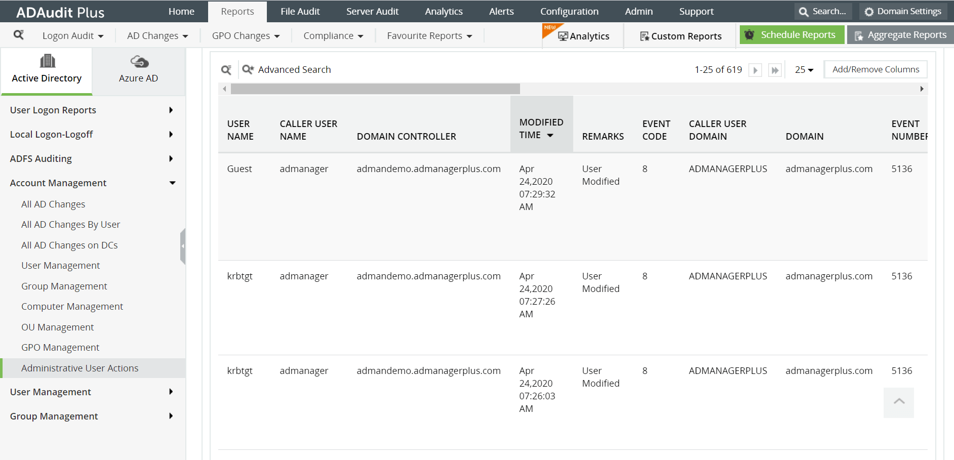 Click on the Reports tab. From the Account Management section in the left pane, select the Administrative User Actions report.