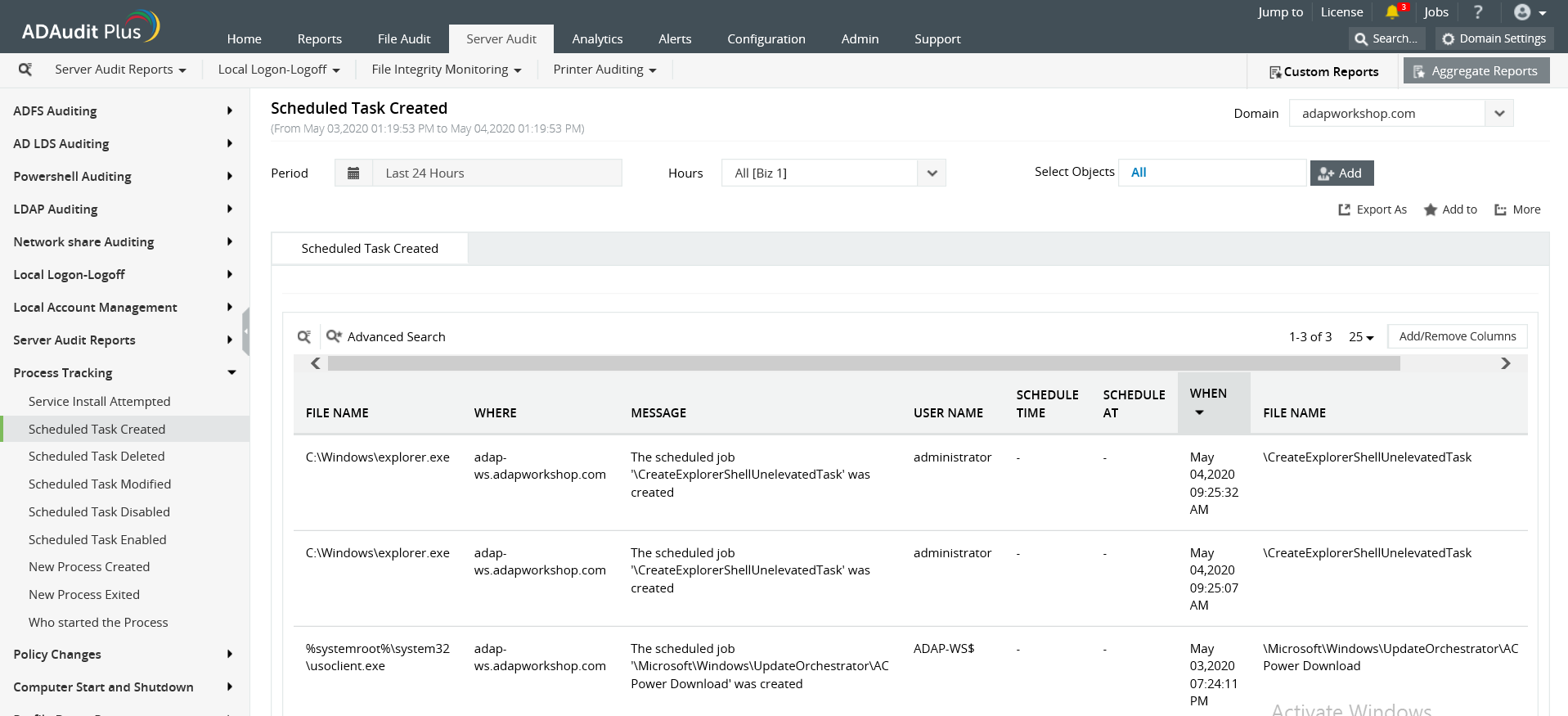 In the ADAudit Plus console, go to 'Server Audit' tab and navigate to 'Process Tracking' on the left pane. This provides you a list of pre-configured reports on process activity within AD.