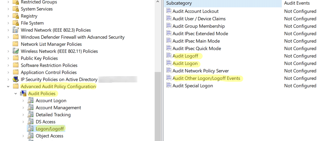 Go back to Computer Configuration. Navigate to Windows Settings -> Security Settings -> Advanced Audit Policy Configuration -> Audit Policy -> Logon/Logoff.