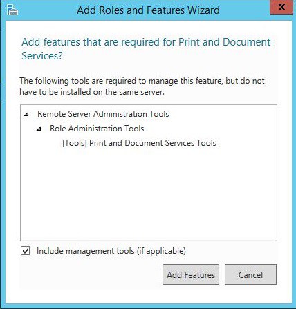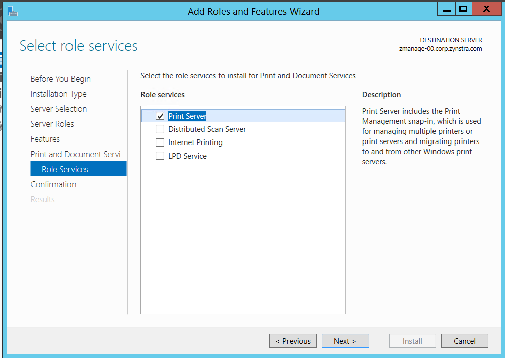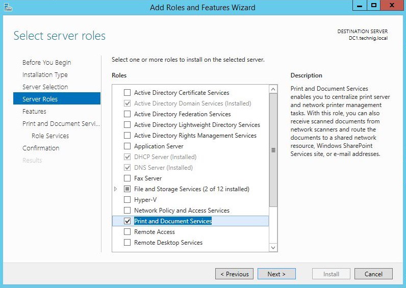 Select the check box of Print and Document Services on the Server Roles page.