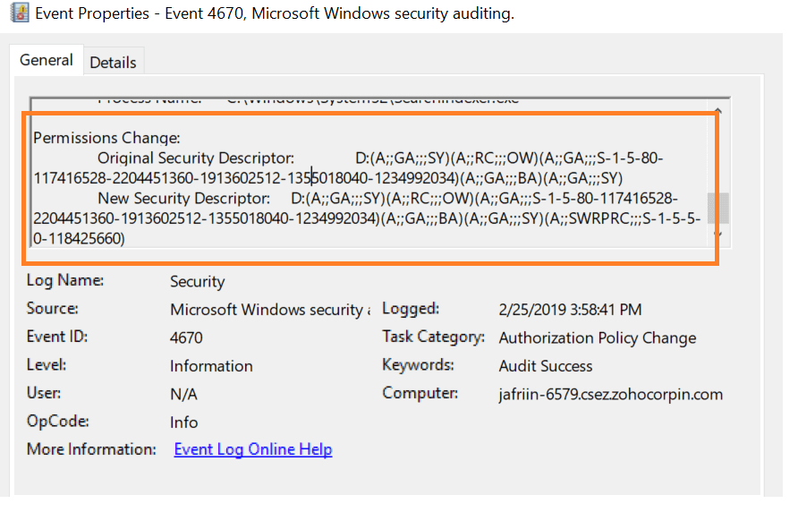 For more information on the exact permission that was changed, you can examine the old and new security descriptor.