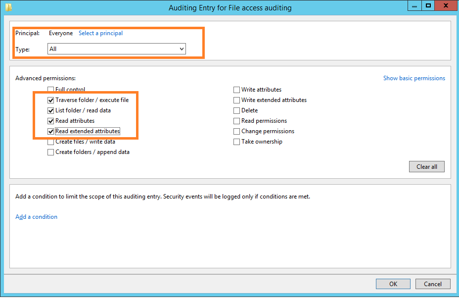 In Advanced Security Settings, go to the Auditing tab and click Add to add a new auditing entry.
