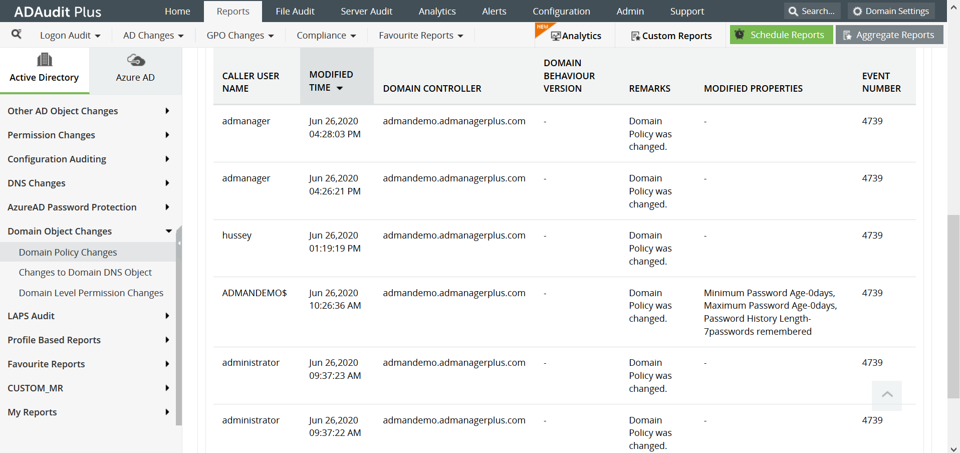 This report can be generated in ADAudit Plus by navigating to Reports > Domain Object Changes > Domain Policy Changes.