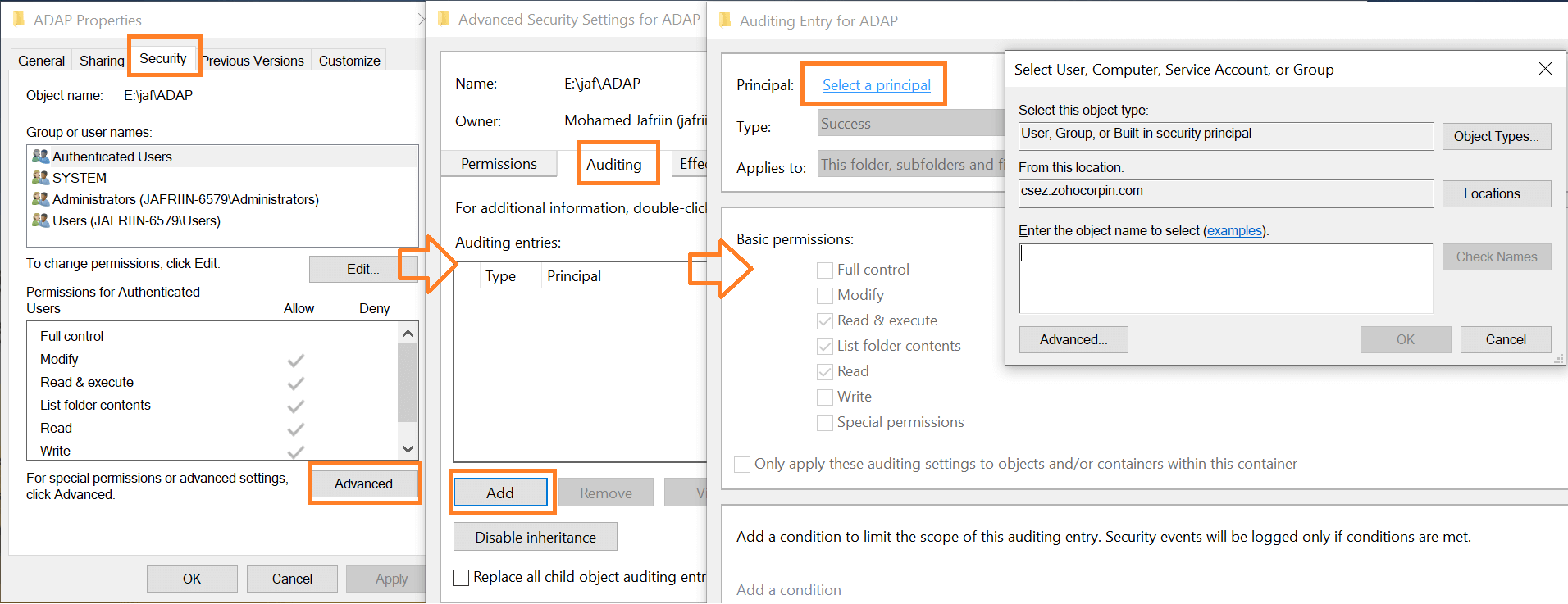 - In the Auditing Entry dialog box, select the types of access you want to audit.