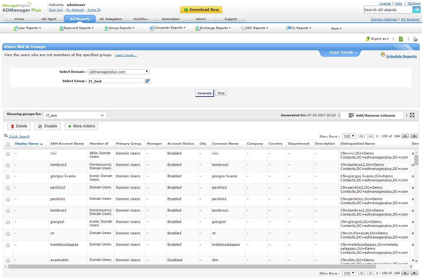 You can also perform the desired management actions right from within these reports. For example, disable or delete specific user accounts right from the Users Not in Groups report.