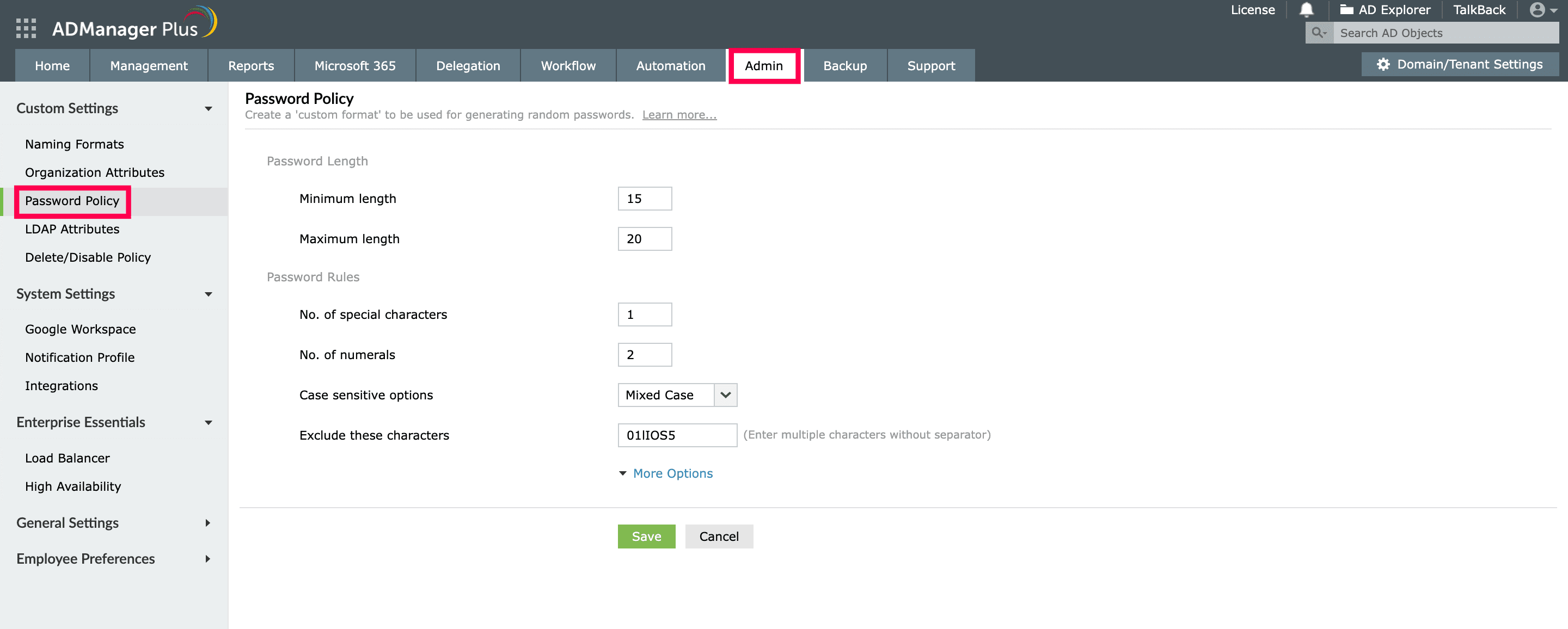 To set the format for generating random passwords in ADManager Plus,