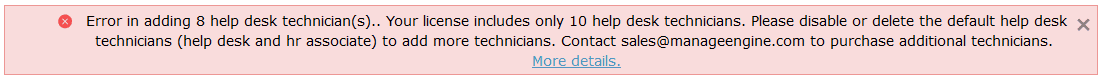 While adding technicians, I get the following error message: Error in adding help desk technician(s)...