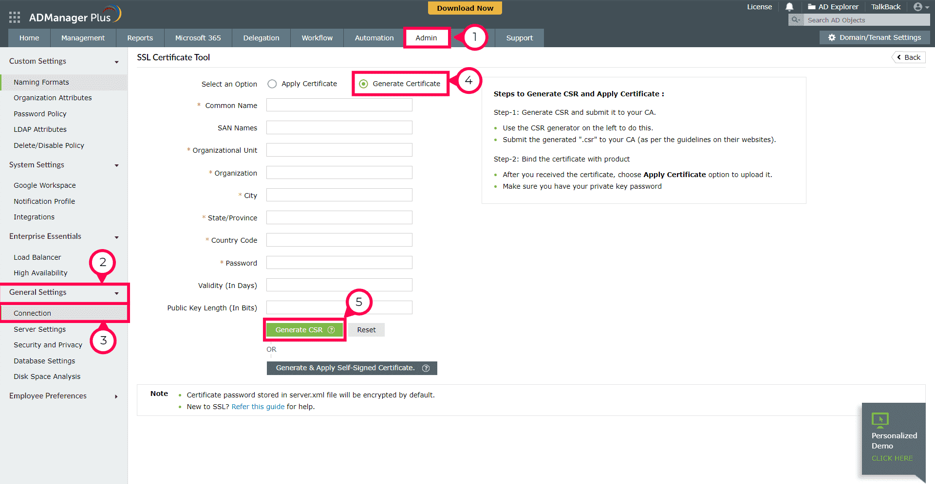 Steps to generate a CSR file using the ADManager Plus GUI.