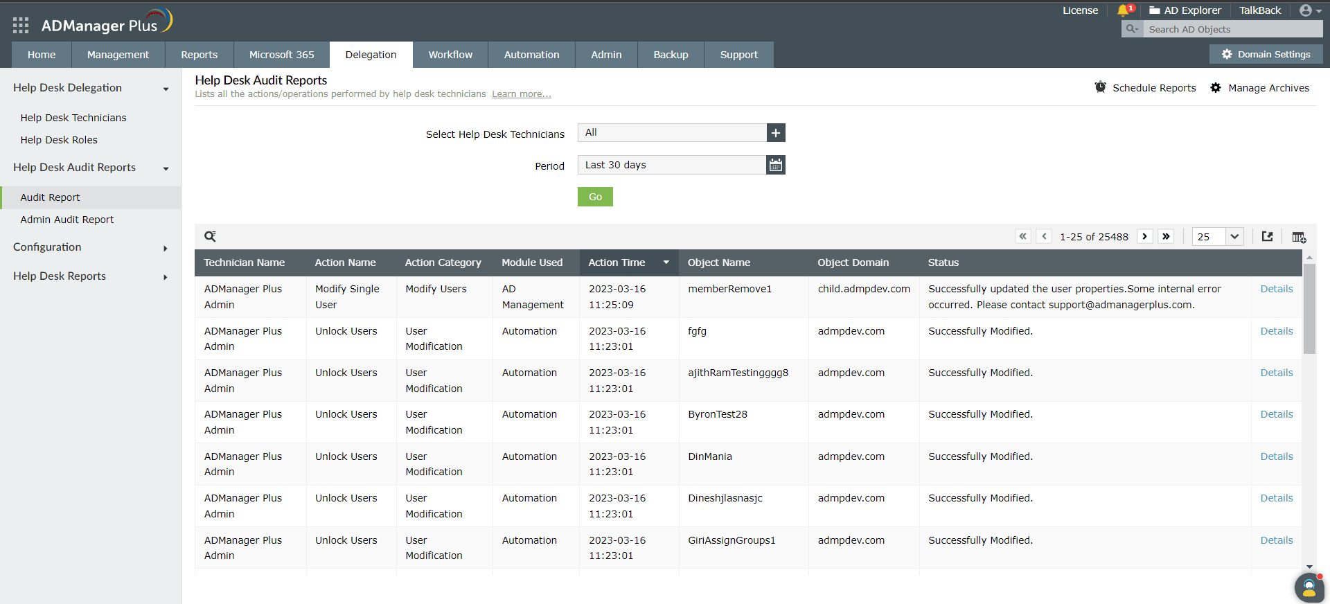 Note: By default, the audit reports are archived every 90 days, and the archives are stored for eight years. This can be customized by clicking on the Manage Archive button in the report window.