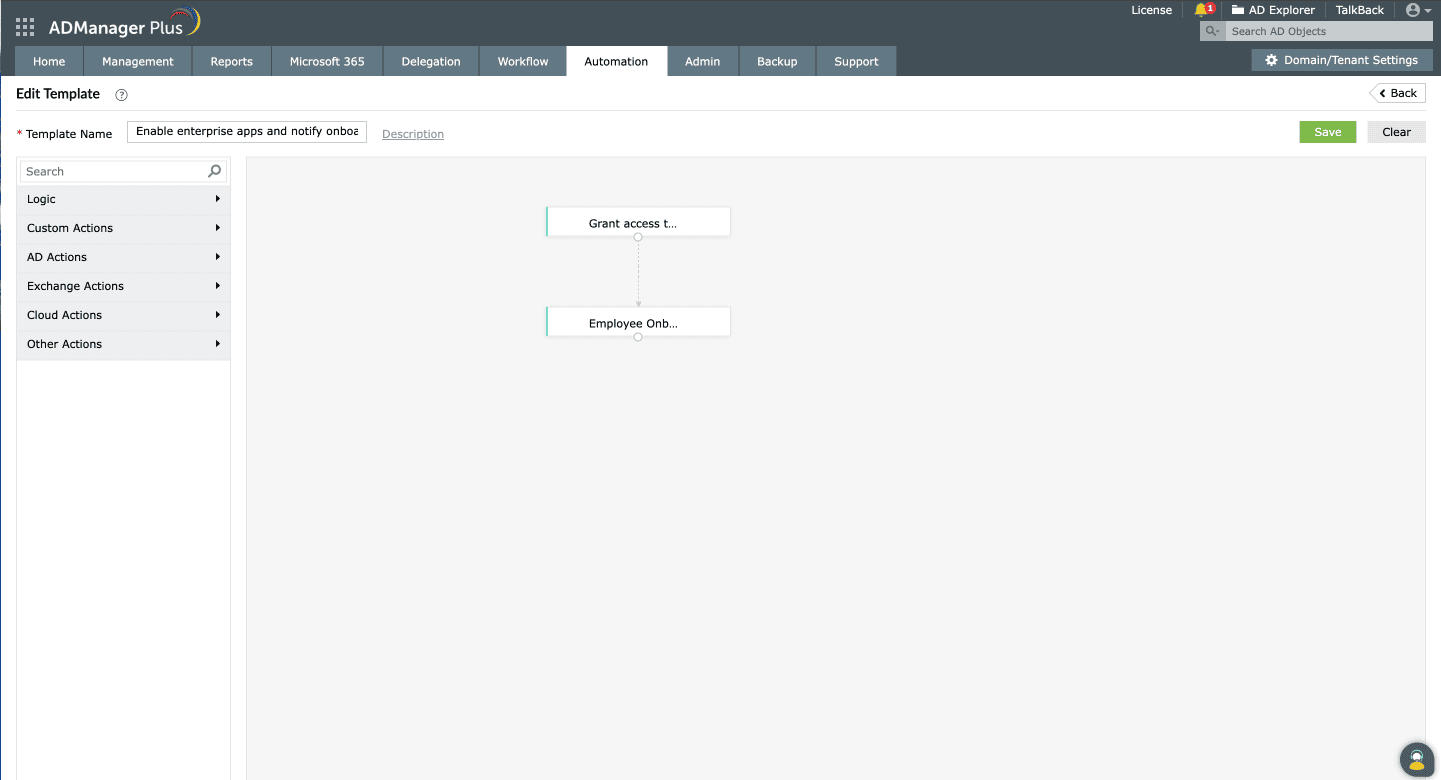Orchestration templates in ADManager Plus help you automatically perform a series of tasks in sequential order in both Active Directory (AD) and enterprise applications. These templates can be used during scheduled or event-driven automations to automate routine management tasks, such as employee onboarding and offboarding, permission management, and more. Orchestration templates can also be applied directly to users to perform cascading actions on them.