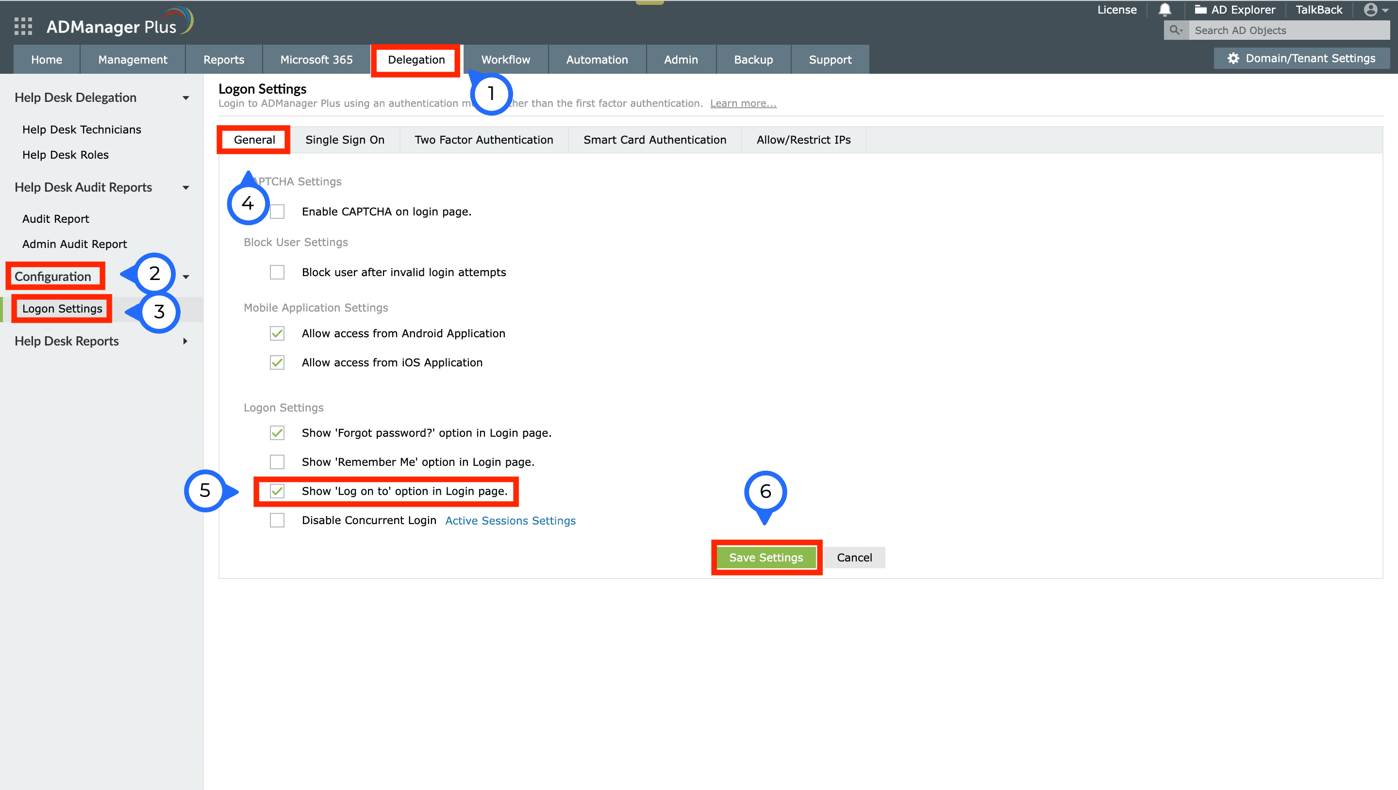 1. Navigate to Delegation > Configuration > Logon Settings > General.