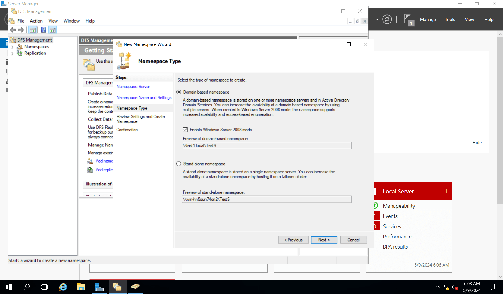 The next step in setting up DFS on Windows Server is to create your namespaces. Namespaces are the names we give to the shared folders that we are replicating. Here is how to set them up: