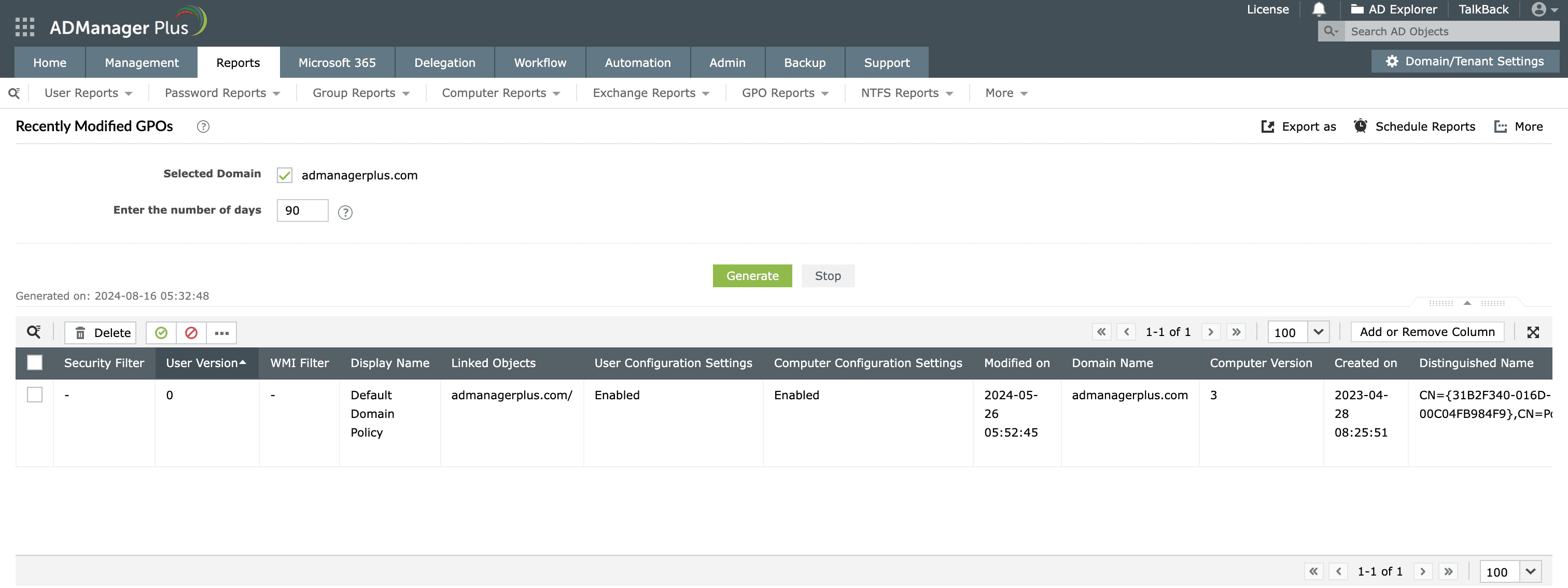 In Active Directory, a Group Policy Object (GPO) is a tool that is used to manage and enforce settings for users and computers across the network. Tracking changes to Group Policies is crucial for maintaining security and compliance within the AD environment. ADManager Plus streamlines this process by offering reports on GPO scope, status, settings, and more that provide detailed insights into policy configurations and the changes.