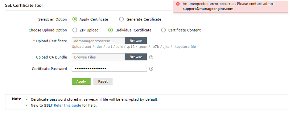 SSL certificate Error: An unexpected error occurred. Please contact support@admanagerplus.com.