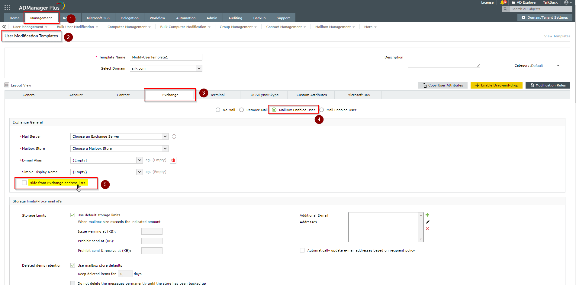 It's important to note that if the users have an on-premise Exchange mailbox, we can use the Exchange tab in the User Modification Templates to enable or disable this attribute. Use the screenshots below as a reference for the same.