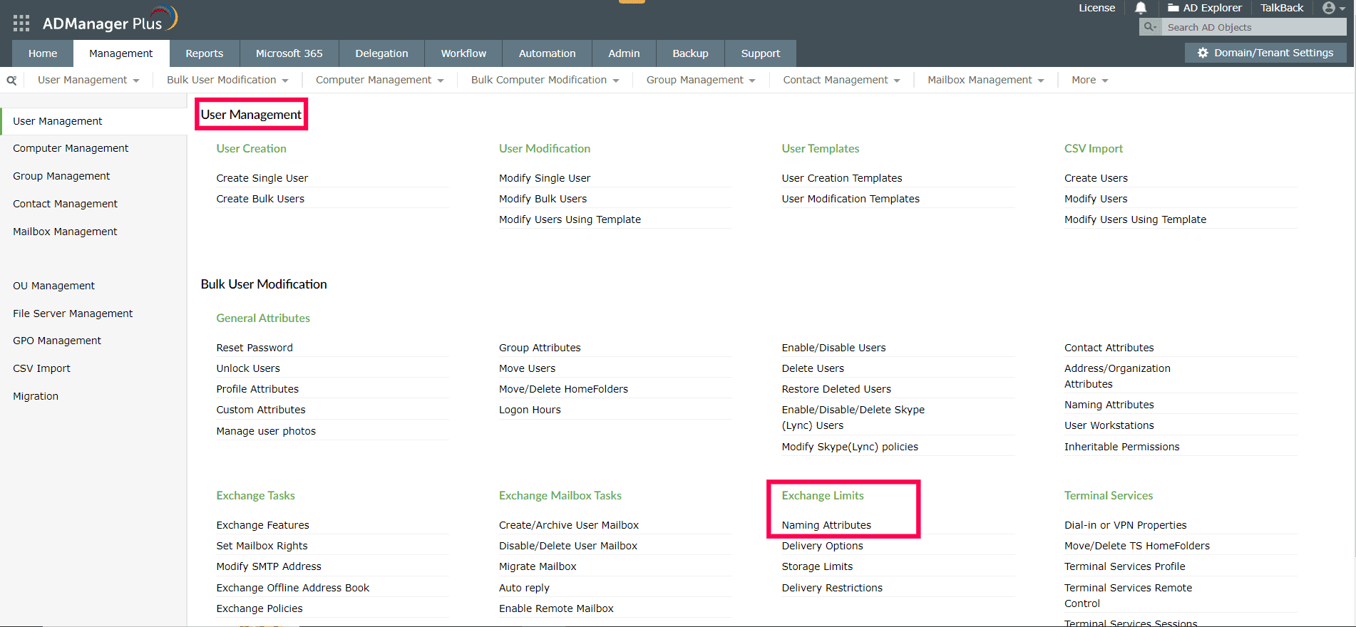 If you are looking to modify this attribute for users in bulk, use the Naming Attributes option under theExchange Limits section in User Managementto set this attribute. To do this, navigate to Management > User Management > select Naming Attributes under the Exchange Limits and update the settings.