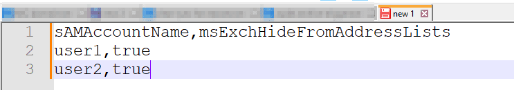 We can also use a CSV file with sAMAccountName and msExchHideFromAddressListscolumns to modify this attribute for users in bulk.