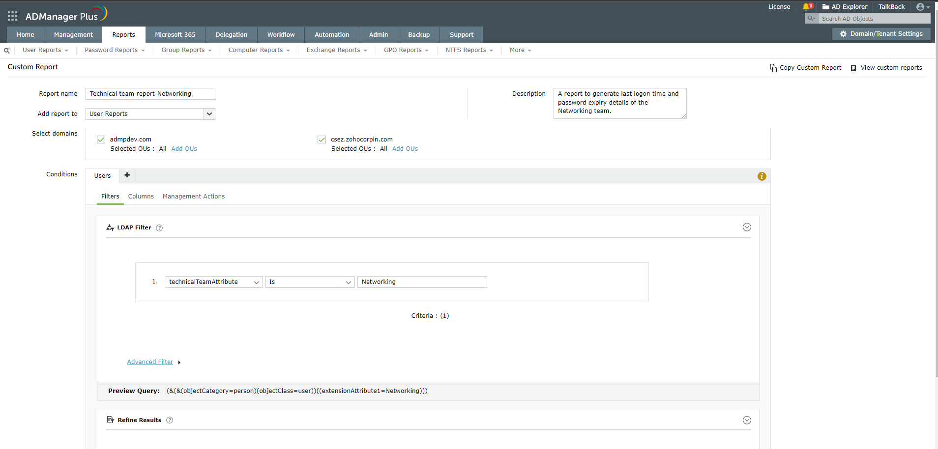 Use case: An organization wants to generate a series of reports based on the values of specific schema attributes, including their custom attribute and technicalteam attribute that they created to define the specific user account function. They want to create reports that include details such as last logon time, password expiration, and more based on that custom attribute; the report needs to be generated for various values of technicalteamAttribute, such as networking, server, and so on. They can either create a new custom report with the above mentioned attributes or include the custom attributes in the filter conditions to get updated reports instantaneously.This makes it easy for the organization to monitor each technical team and share a particular team's report amongst team members.