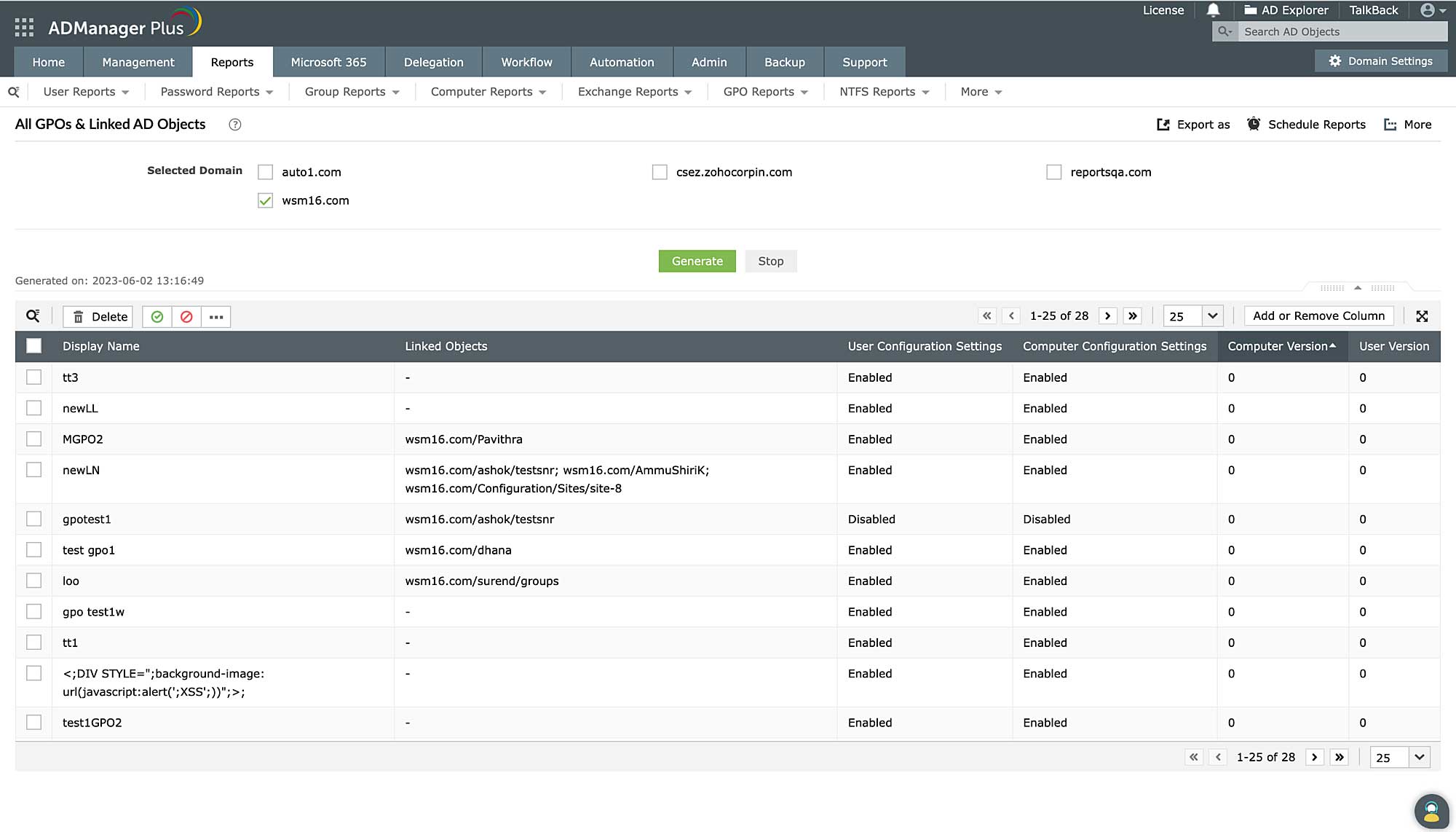 Identify long-forgotten test GPOs using ADManager Plus' All GPOs & Linked AD Objects report. View all the GPOs in your AD, including their linked objects and settings. Wondering how to detect empty GPOs? If a GPO's Computer Version and User Version are listed as zero, that GPO doesn't have any settings. Once you've identified empty GPOs, you can easily delete them from the GPO reports console itself.