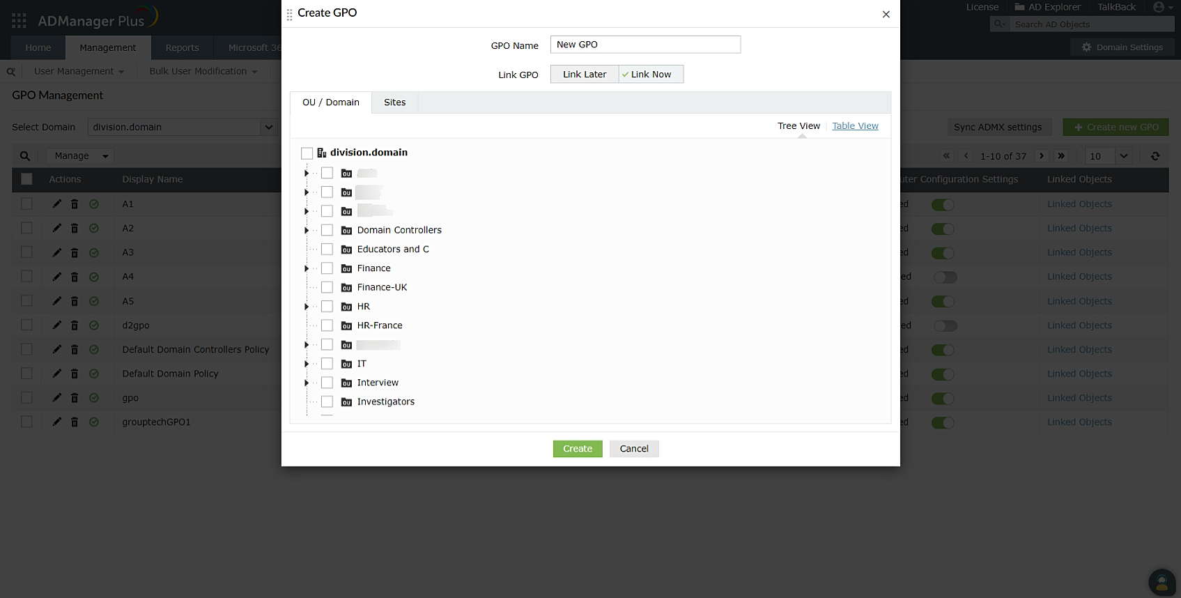 Creating GPOs and linking them with multiple AD nodes is not any easy task using Microsoft's Group Policy Management Console (GPMC). With ManageEngine ADManager Plus, admins can use a single console to create a GPO and link it to multiple nodes all at once, as shown in Figure 1.
