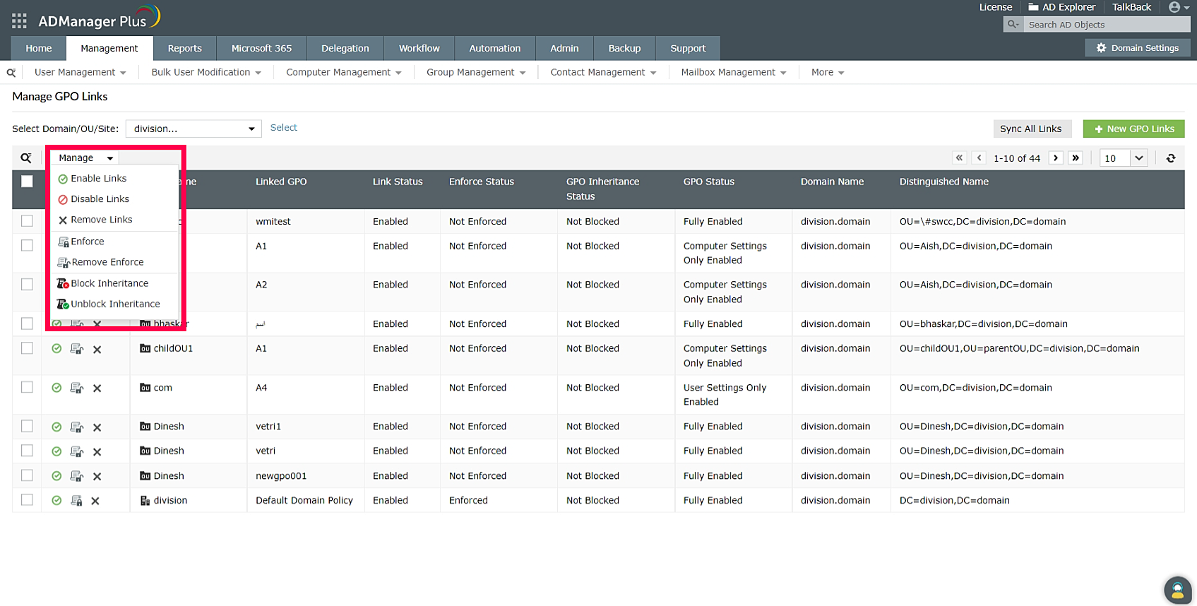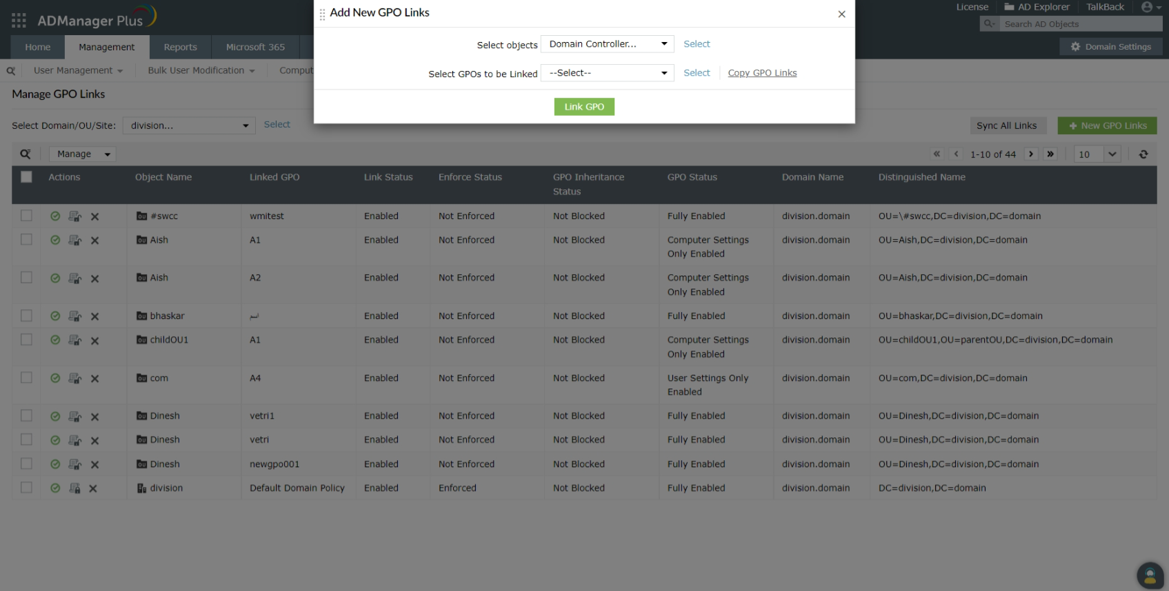 Configuring a GPO that needs to be linked with multiple nodes is a repetitive and inefficient task. However, ADManager Plus makes GPO link management easy by allowing administrators to link GPOs to multiple nodes in a single click (Figure 4).
