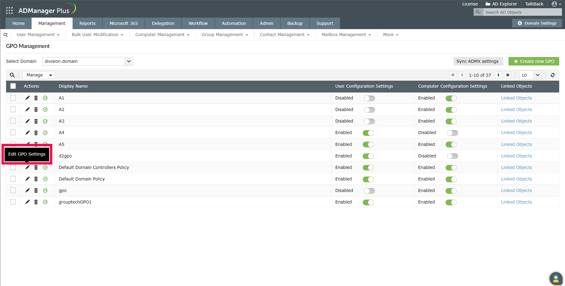 Admins often have to create new GPOs or modify existing ones to meet the changing needs of their organization. With ADManager Plus, these actions can be easily performed using ADManager Plus' GPO management feature. It enables admins to edit the Administrative Template settings for both user and computer configurations of GPOs.